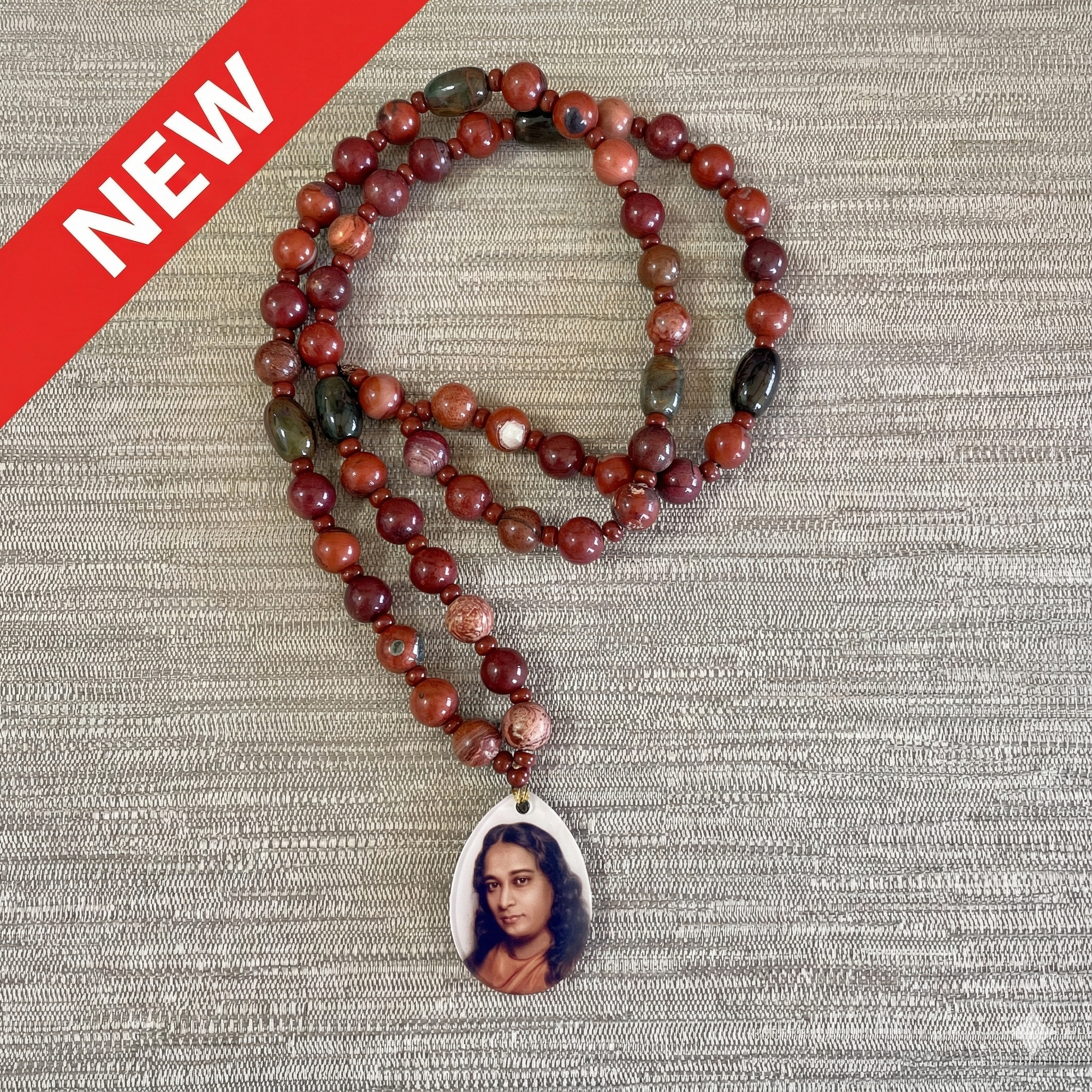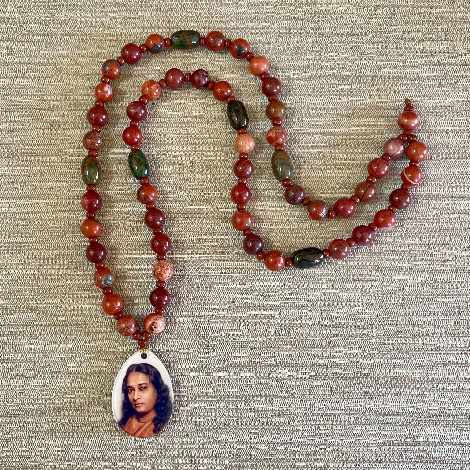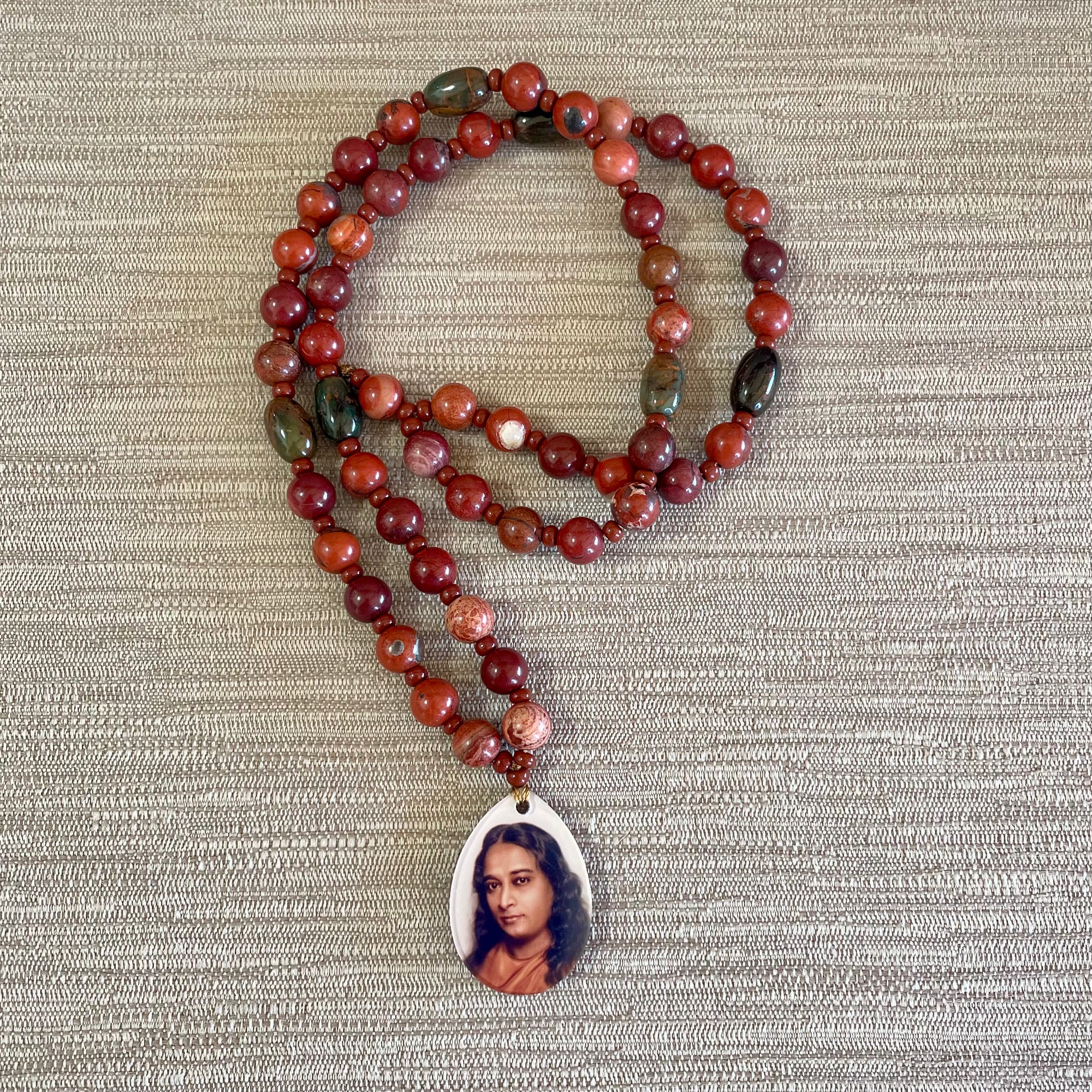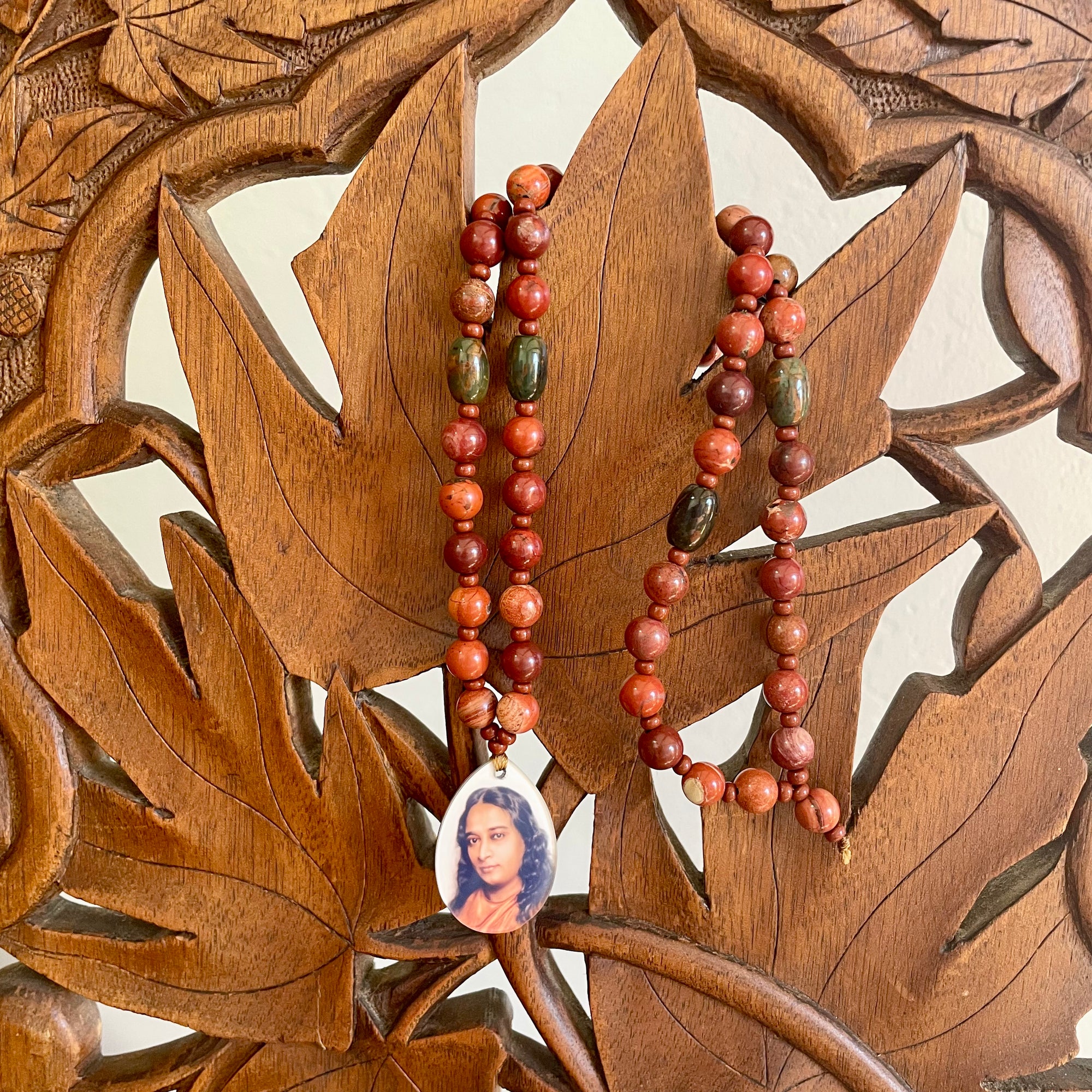 It is hand made from beautiful earthy ochre colored Red Flake Jasper, accented with Green Opal beads and finished with a pendant of Gurudeva’s image from India.